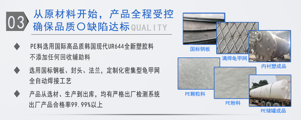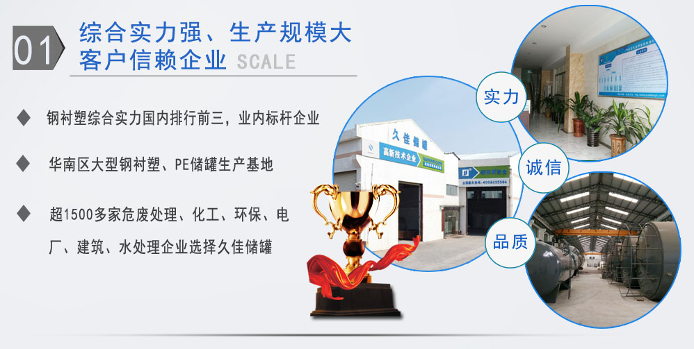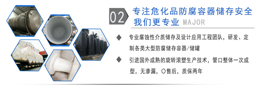 公司有鋼襯塑PE/PO、PE全塑、碳鋼、不銹鋼四大系列100多個品種,專注于常壓儲存容器生產,其產品包括鋼襯塑儲罐、管口一體成型PE儲罐碳鋼儲罐不銹鋼儲罐、反應釜、攪拌罐、離子交換柱、鋼襯PE/PO儲罐、塑料儲罐、鹽酸儲罐硫酸儲罐等等。更大限度滿足廣大客戶的各種需求,同時可以根據客戶的需要加工定制各種防腐設備。